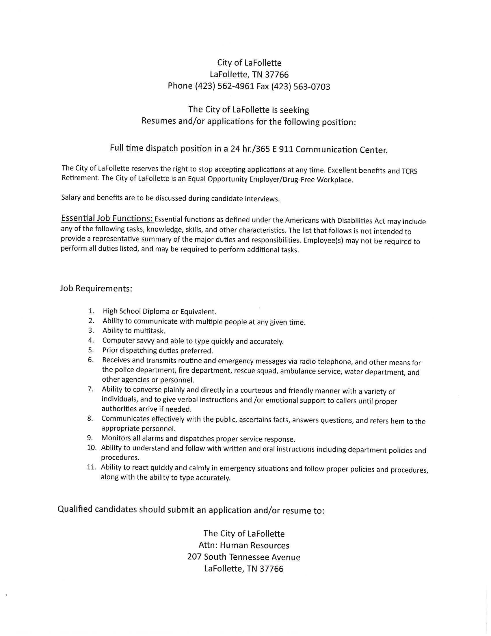 If you would like to apply for a position, please fill out the employment application completely and return it to the City Clerk's office. You may obtain an application from the Clerk's office or you may print the application by following the link below.